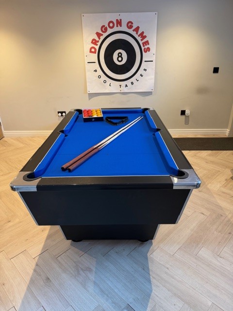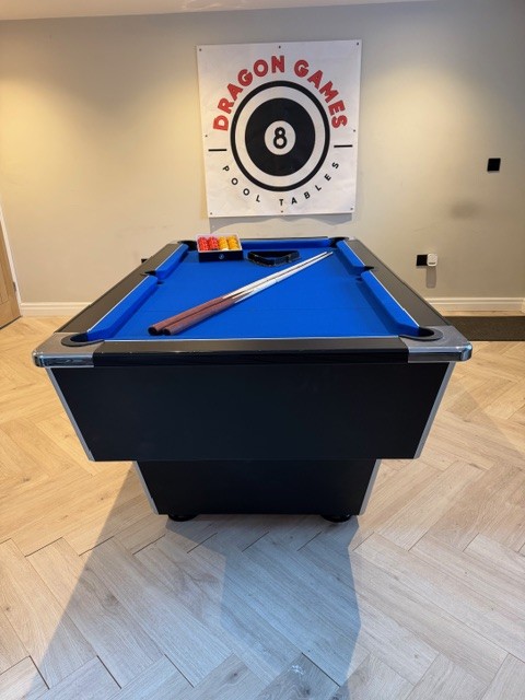 The table finish is Black and will come fitted in brand new Hainsworth Blue cloth.