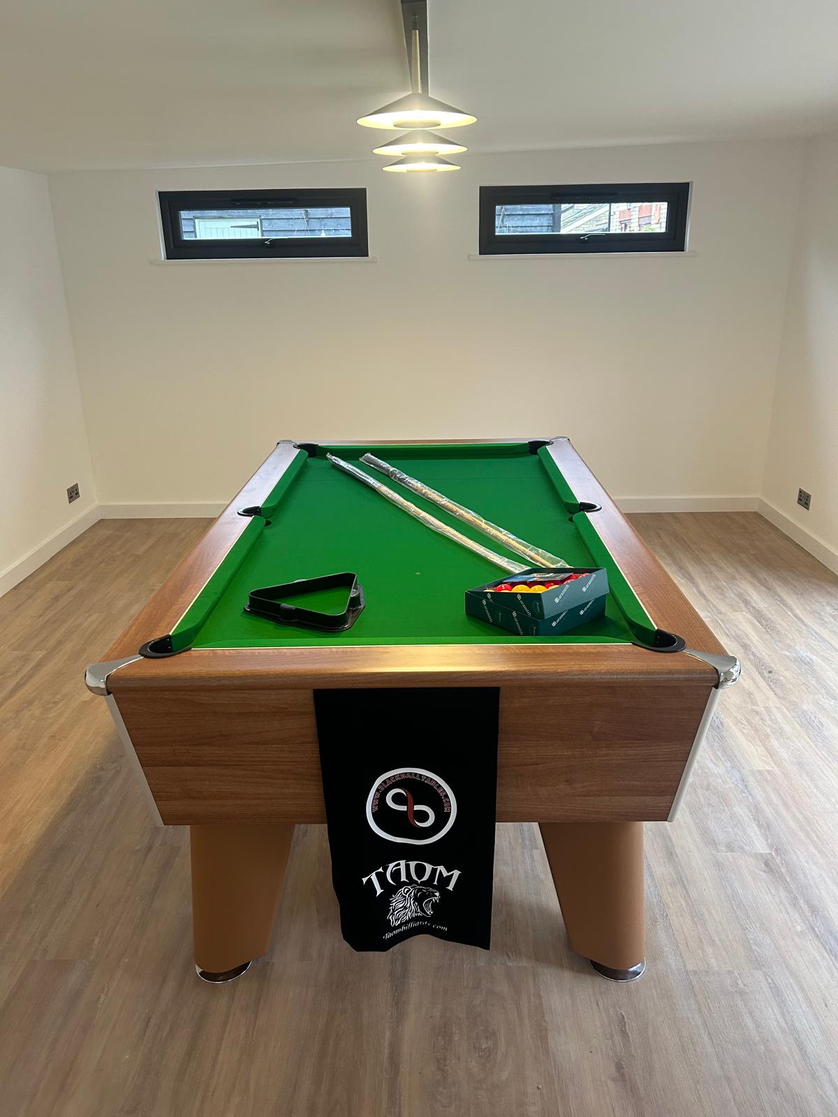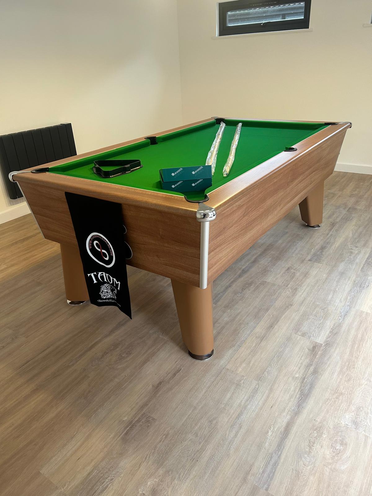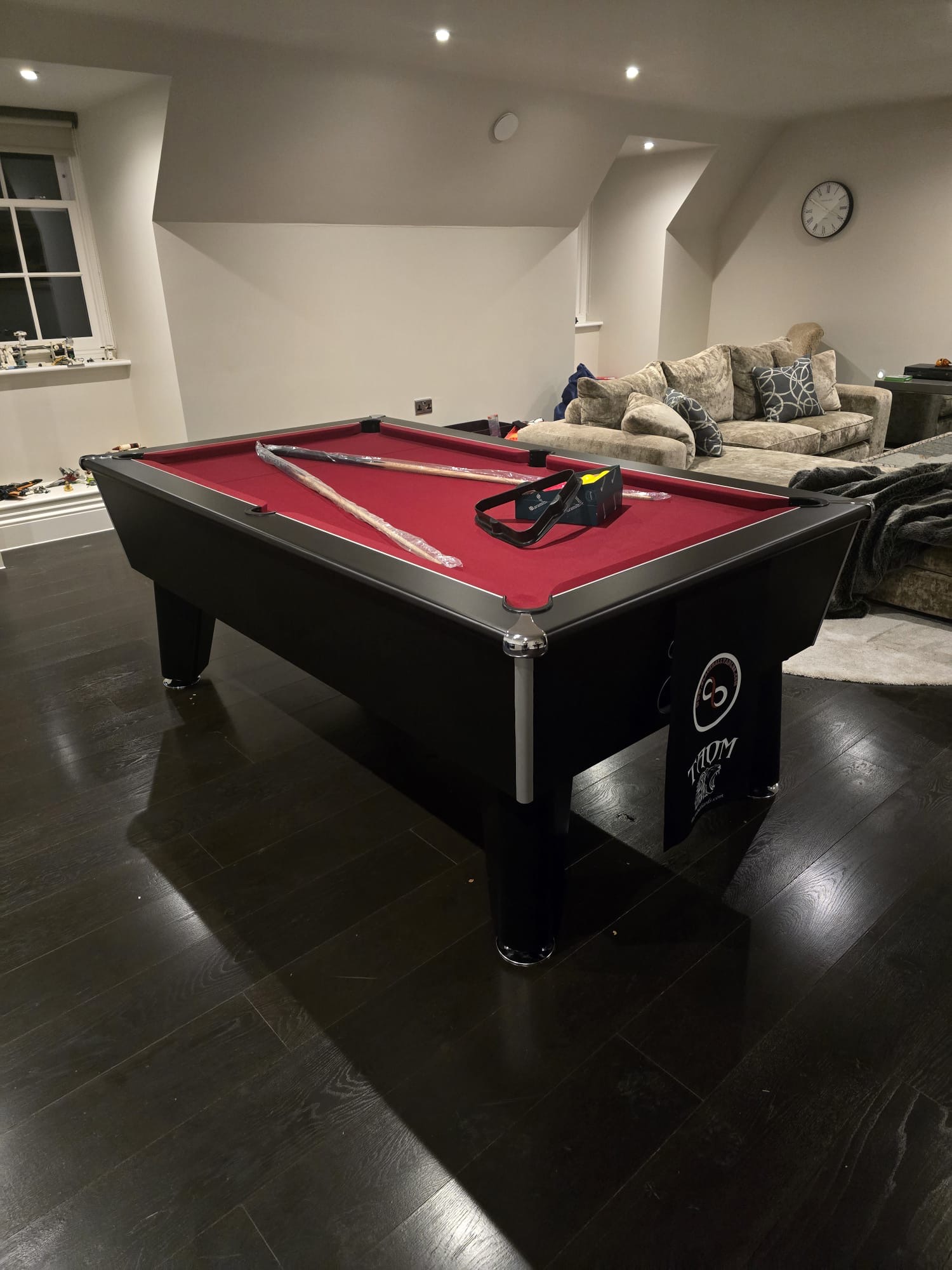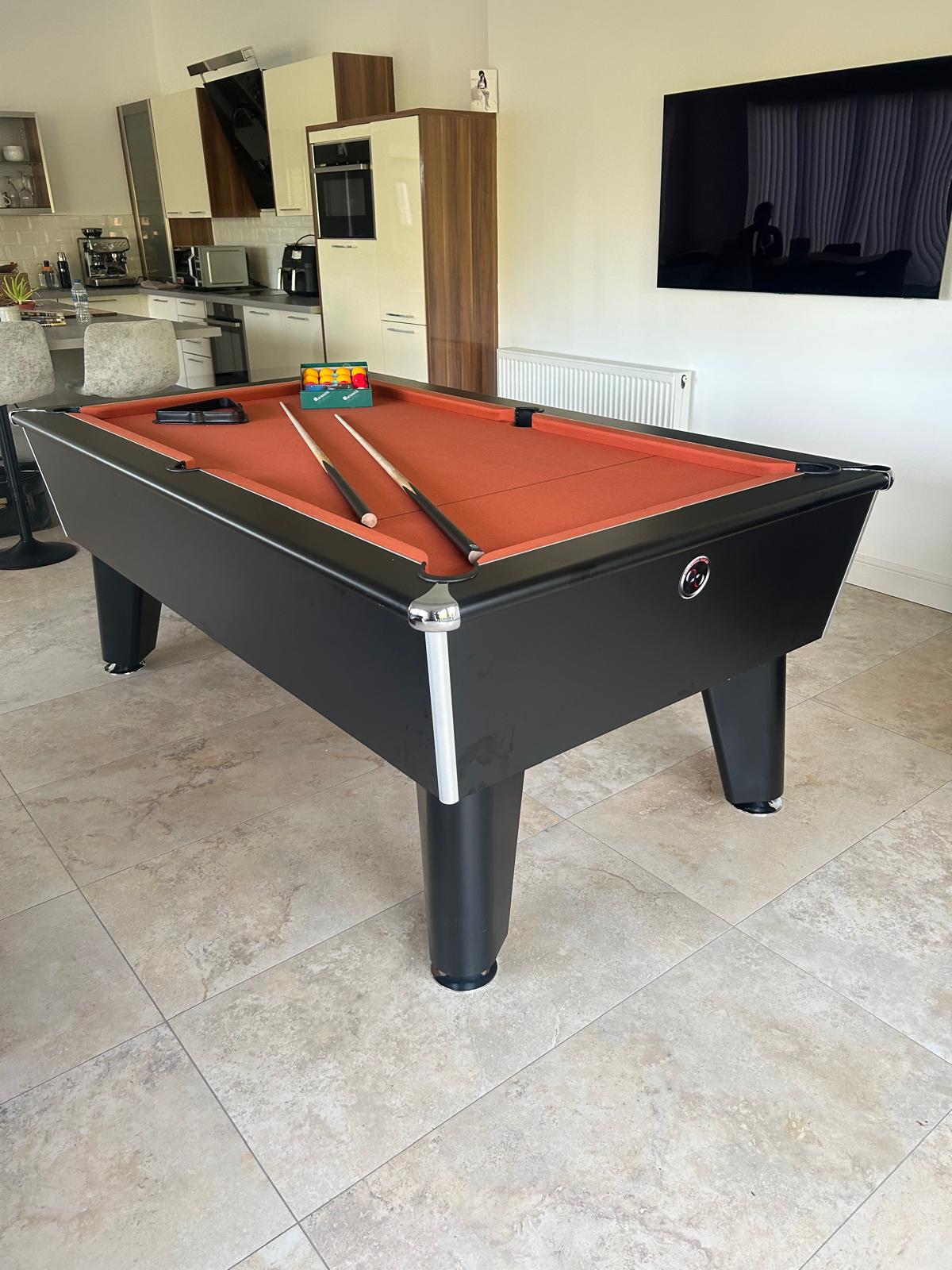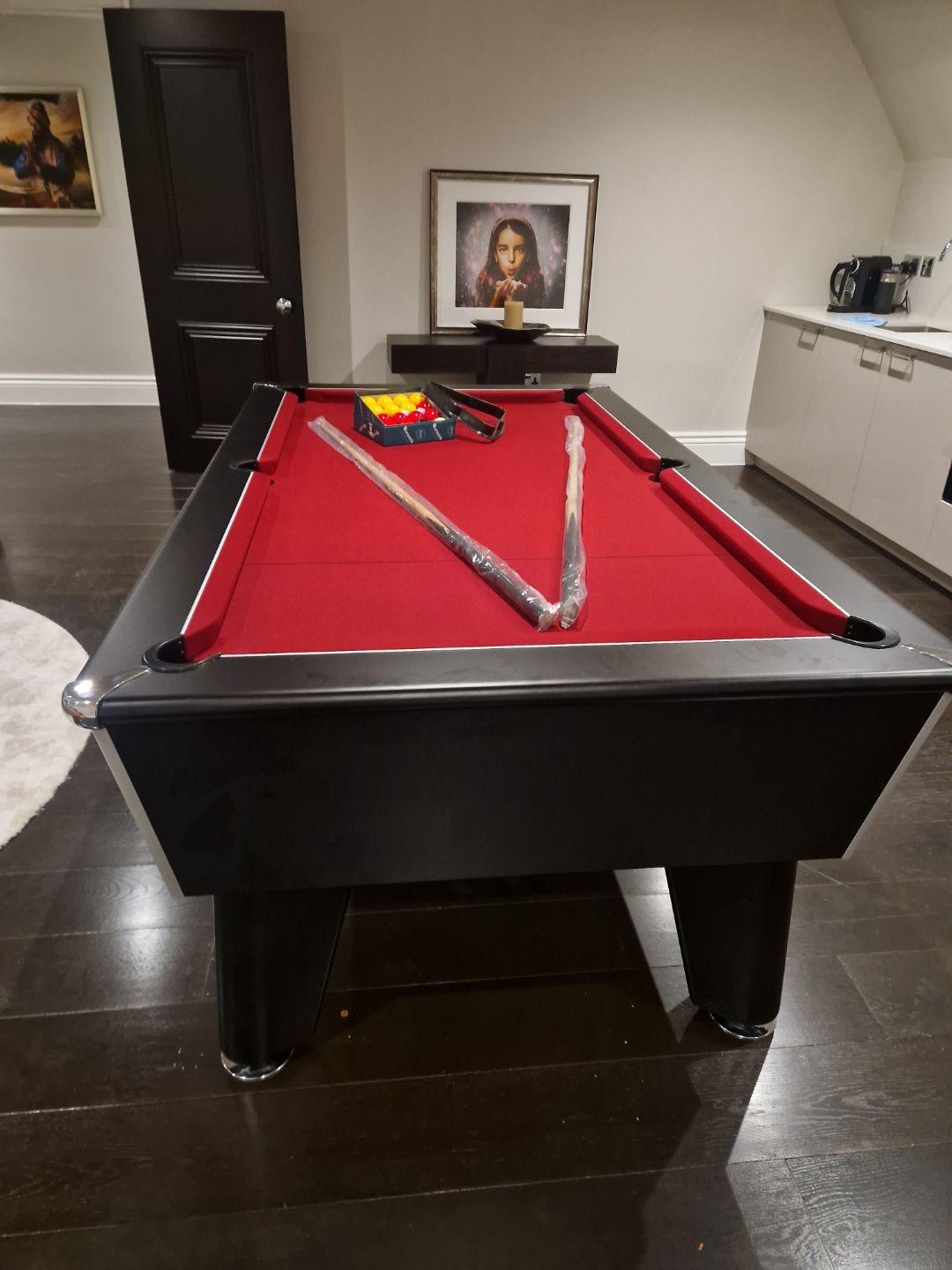 The table comes complete with accessories: 2 x Ash cues (48” with 6ft tables and 57” with 7ft tables), Aramith red and yellow balls, triangle and chalk.