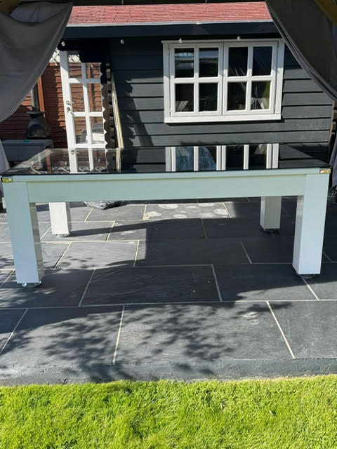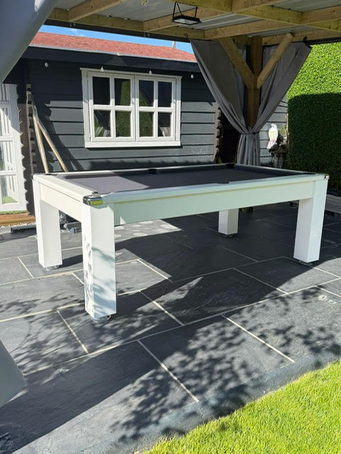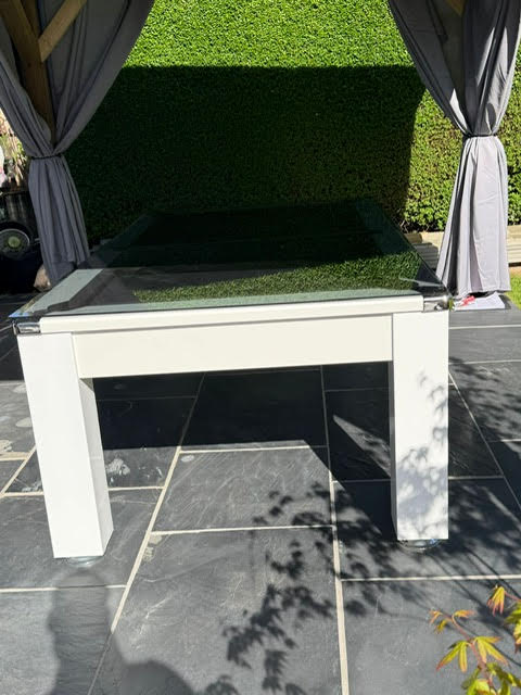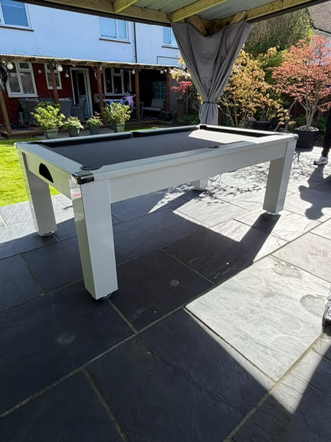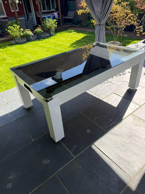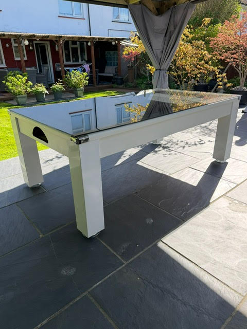 The table body is birch plywood with a White laminated covering, This outdoor pool table also doubles up as a stylish dining table, supplied with a 2 piece, 6 mm thick, toughened Smoked Glass tops. The glass tops sit on the rubber pockets.
